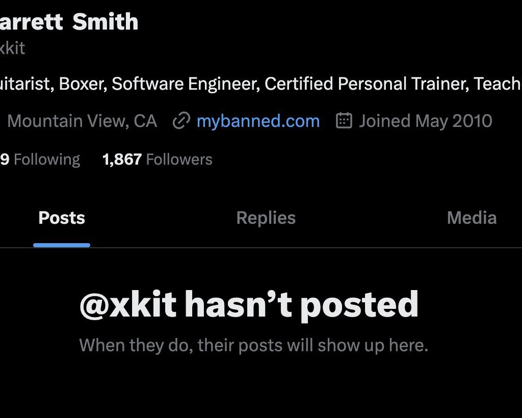 Noticing that, I logged out to check what others could see. My timeline was gone — replaced with the lie: “@xkit hasn’t posted yet.”
